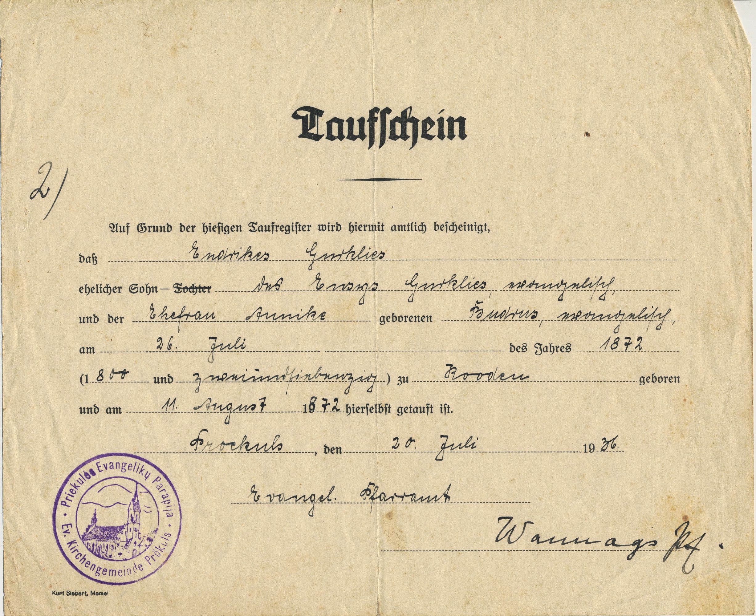 | Taufe eines Sohns | Endrikis (Heinrich) GURKLYS 11. August 1872 (Alter 33 Jahre) Quelle: Taufbescheinigung |