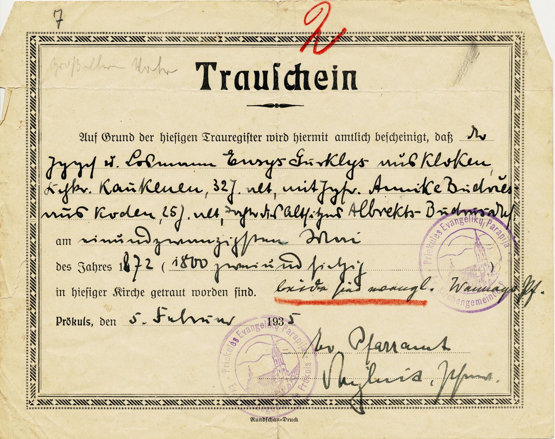 Heirat: 21. Mai 1872 — Prökuls, Memel, Ostpreußen, DEUTSCHLAND |