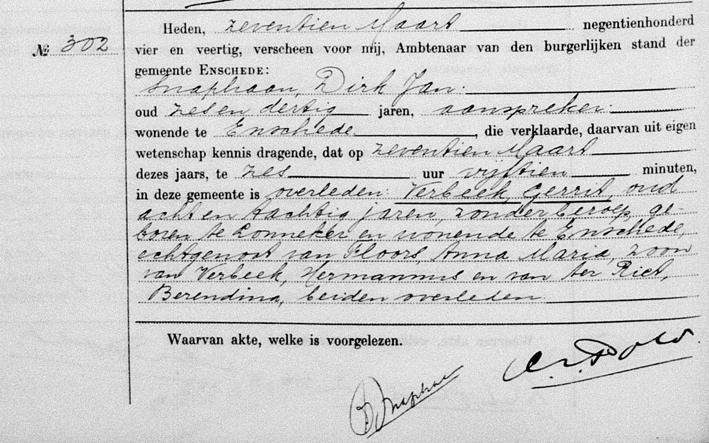 | Tod eines väterlichen Großvaters | Gerrit VERBEEK 17. März 1944 (Alter 35 Jahre) Quelle: Enschede, Civil Registration |