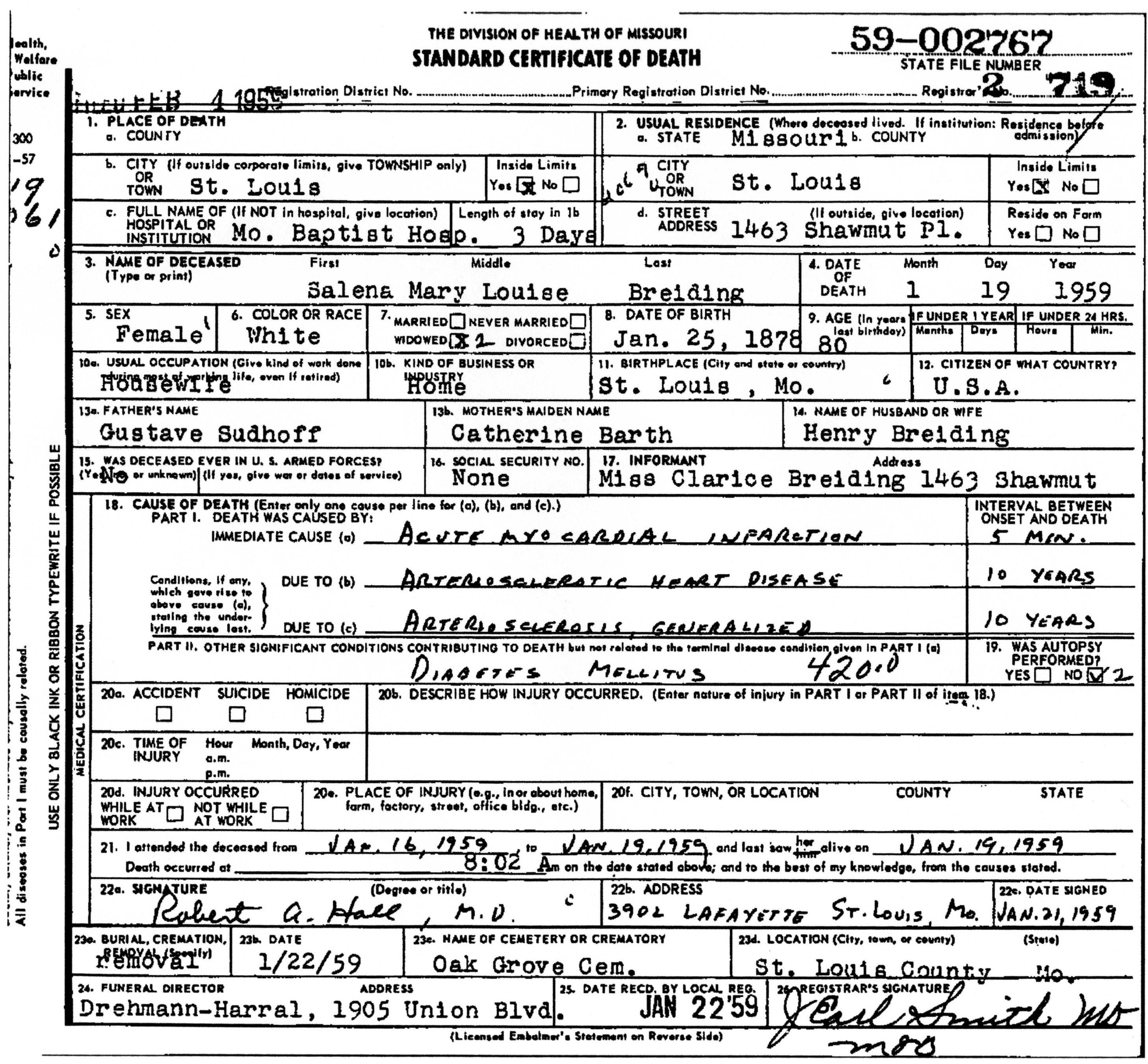 Anna Louisa Salena SUDHOFF Geburt: 25. Januar 1878 48 43 — St. Louis, St. Louis, Missouri, USA Tod: 19. Januar 1959 — St. Louis, St. Louis, Missouri, USA |