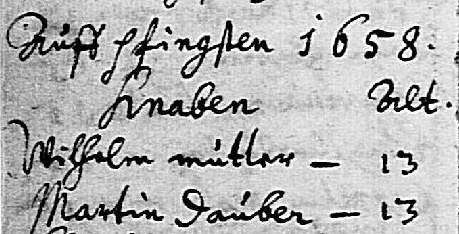 | Taufe eines Bruders | Johannes Jacob MÜLLER 2. April 1658 (Alter 13 Jahre) |