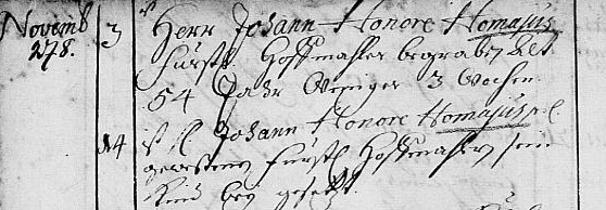 Johann Christoph HOMAGIUS Taufe: 10. Oktober 1684 41 41 — Cassel - Hofgemeinde, Kassel, Hessen, DEUTSCHLAND Beerdigung: 30. April 1735 — Cassel - Altstadt, Kassel, Hessen, DEUTSCHLAND |