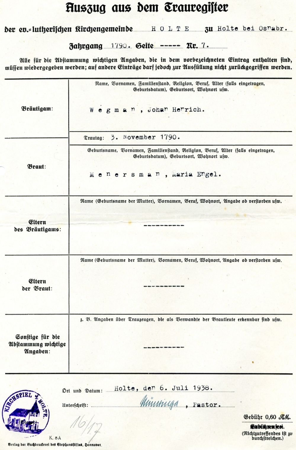 Cath. Engel MENERSMANN Geburt: 27. August 1773 43 32 — Holte (Bissendorf), Osnabrück, Niedersachsen, DEUTSCHLAND |
