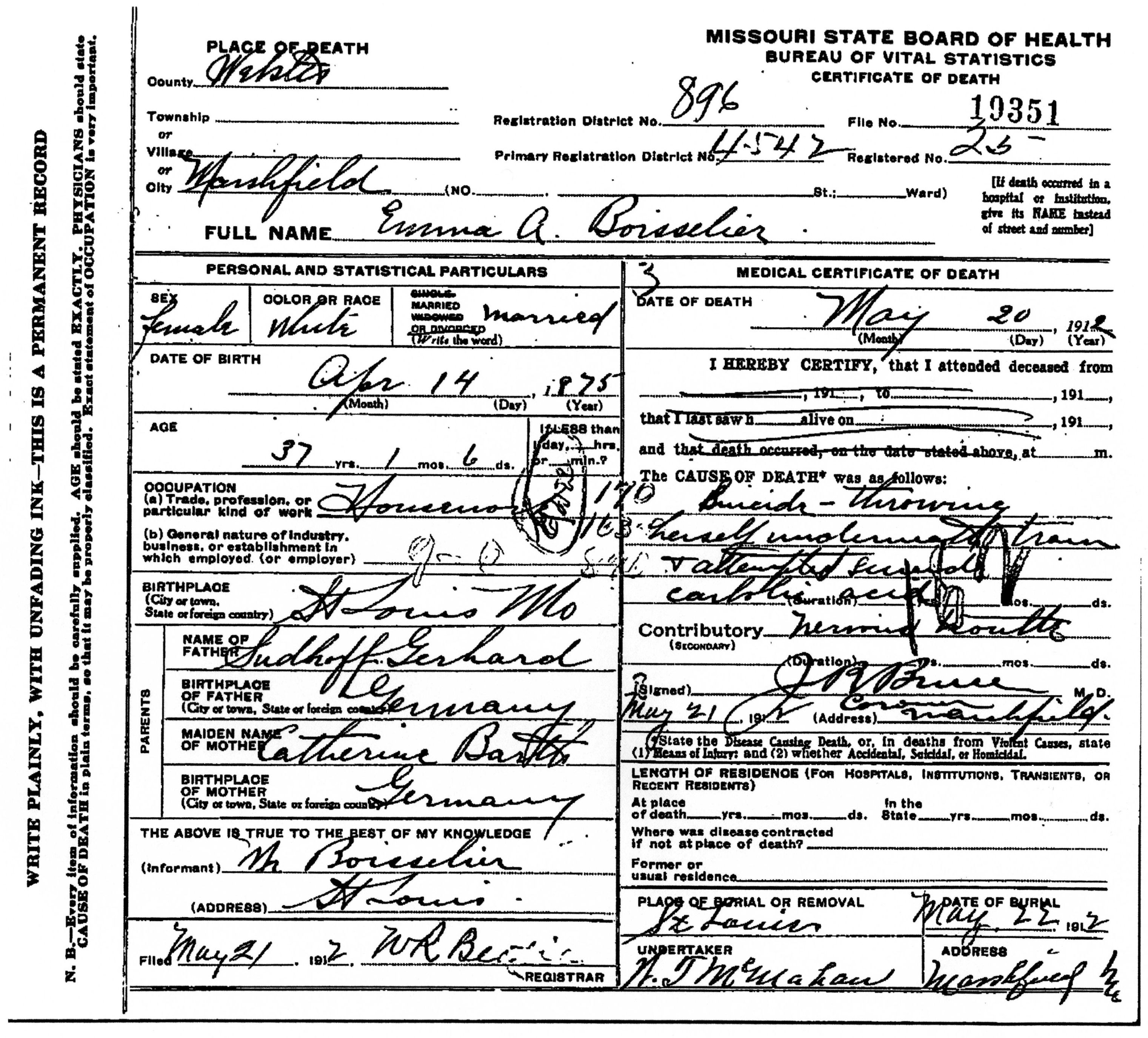 Gerhard Heinrich Louis SUDHOFF Geburt: 13. Dezember 1866 37 32 — St. Louis, St. Louis, Missouri, USA Tod: 30. Dezember 1930 — St. Louis, St. Louis, Missouri, USA |