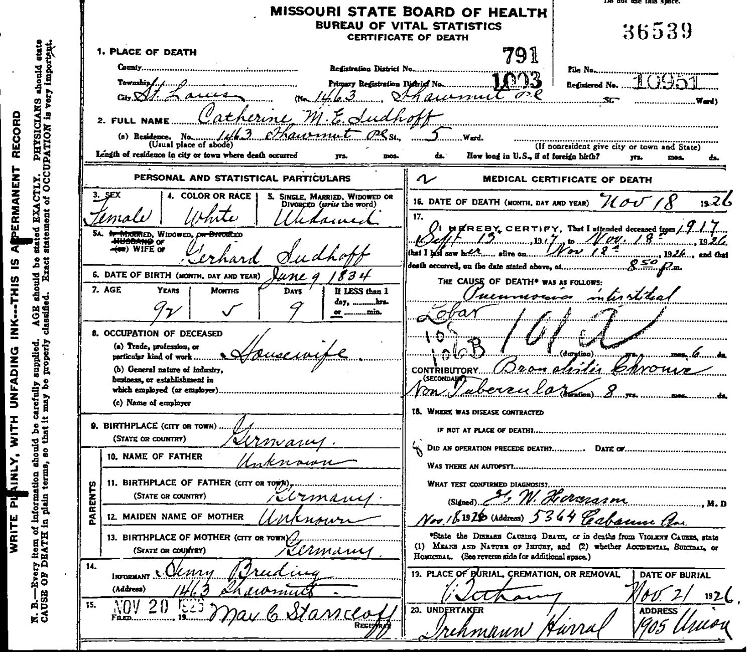 Catharine Marie Elizabeth BARTH Geburt: 9. Juni 1834 — DEUTSCHLAND Tod: 18. November 1926 — St. Louis, St. Louis, Missouri, USA |