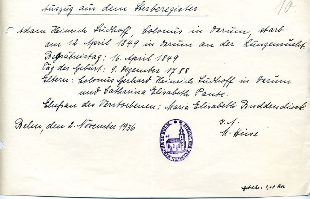 Adam Heinrich SUDHOF Geburt: 9. Dezember 1788 36 36 — Darum (Osnabrück), Osnabrück, Niedersachsen, DEUTSCHLAND Tod: 12. April 1849 — Darum (Osnabrück), Osnabrück, Niedersachsen, DEUTSCHLAND |