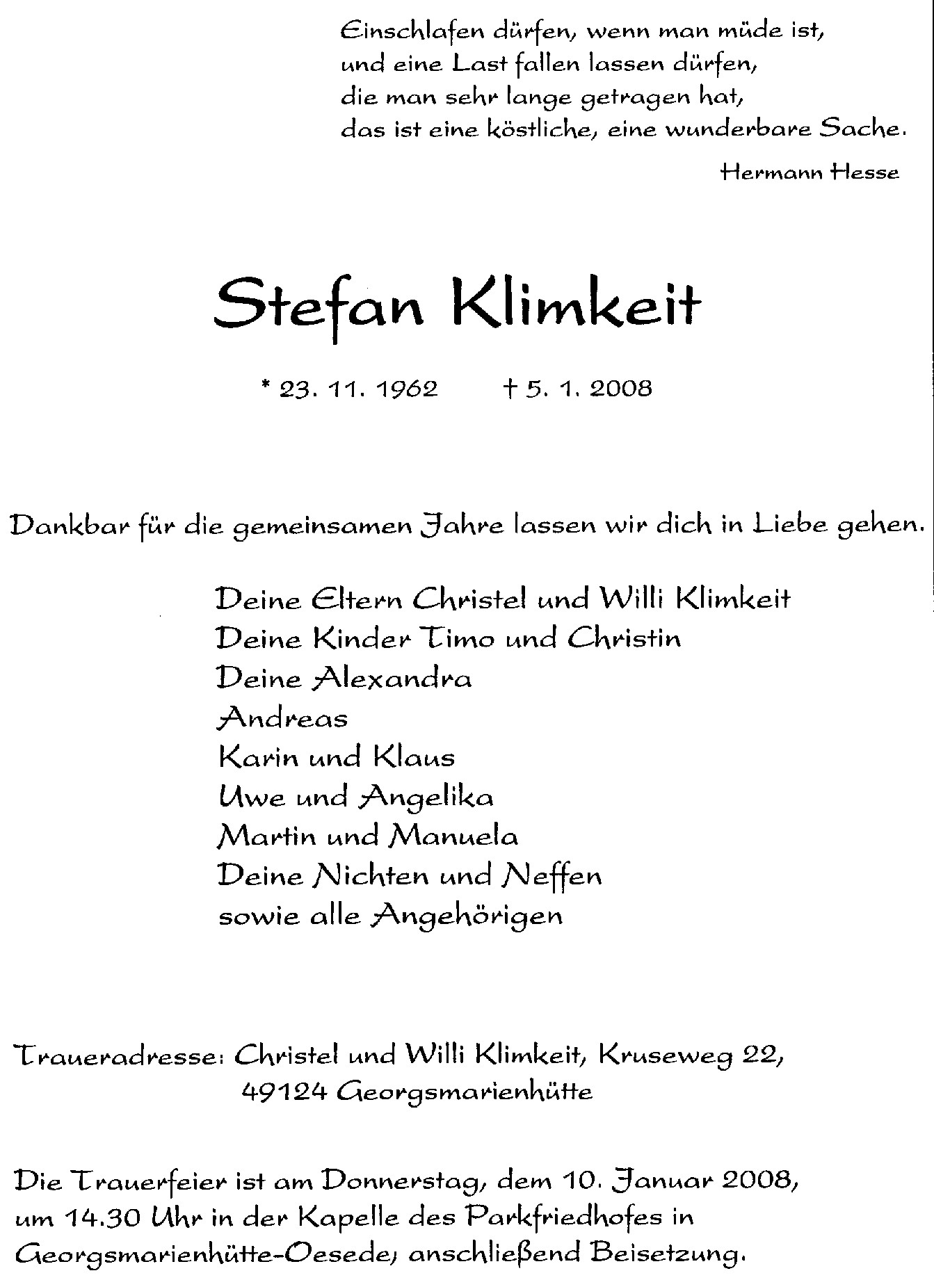 | Tod eines väterlichen Großvaters | Wilhelm Martin KLIMKEIT 23. Juni 1975 (Alter 12 Jahre) Quelle: Traueranzeige |