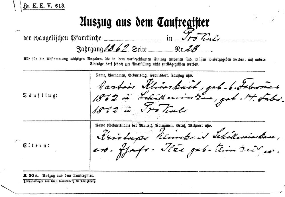 | Tod eines Vaters | Christoph (Kristups) KLIMKEIT nach 11. Oktober 1904 (Alter 42 Jahre) |