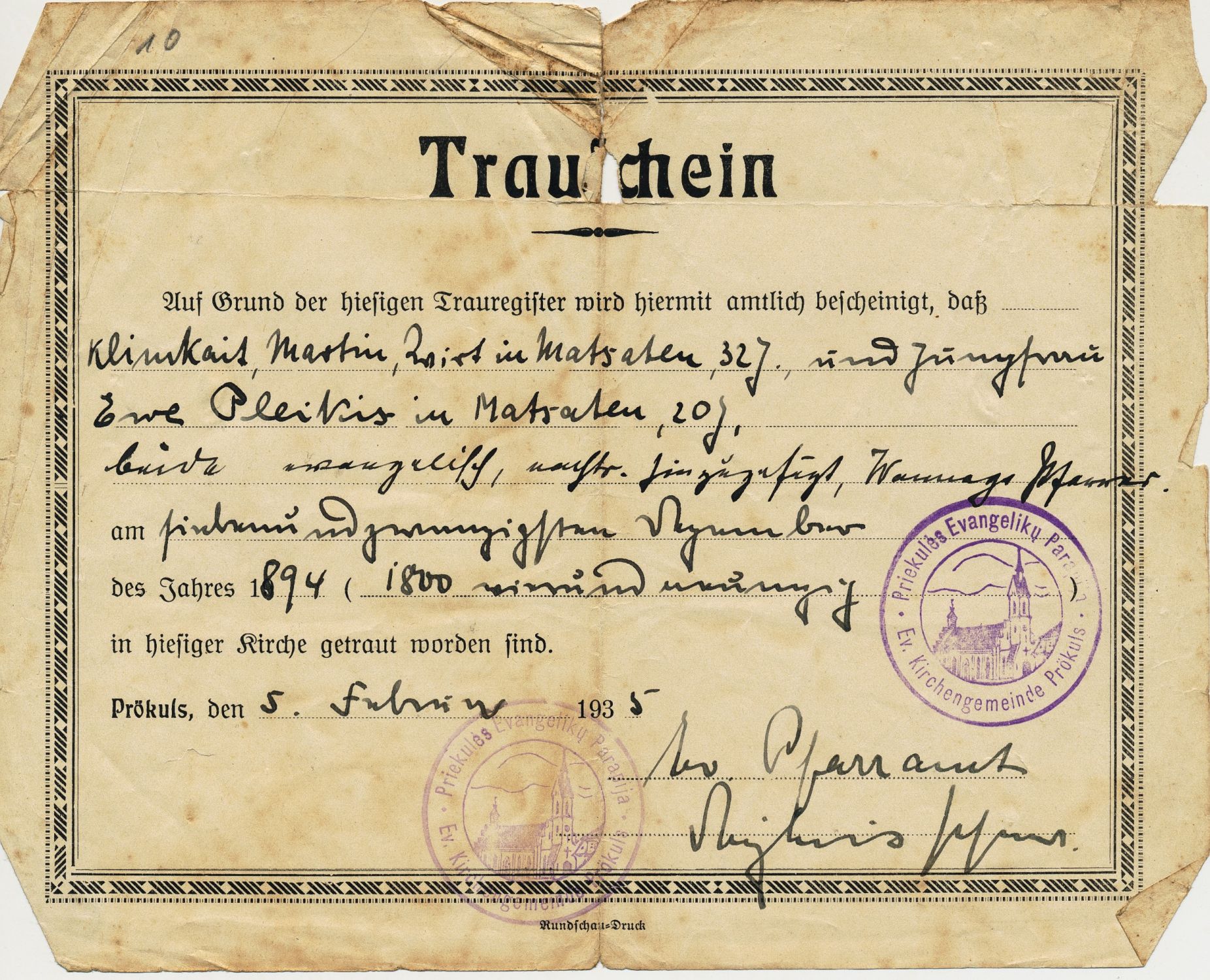 Heirat: 27. September 1894 — Prökuls, Memel, Ostpreußen, DEUTSCHLAND |