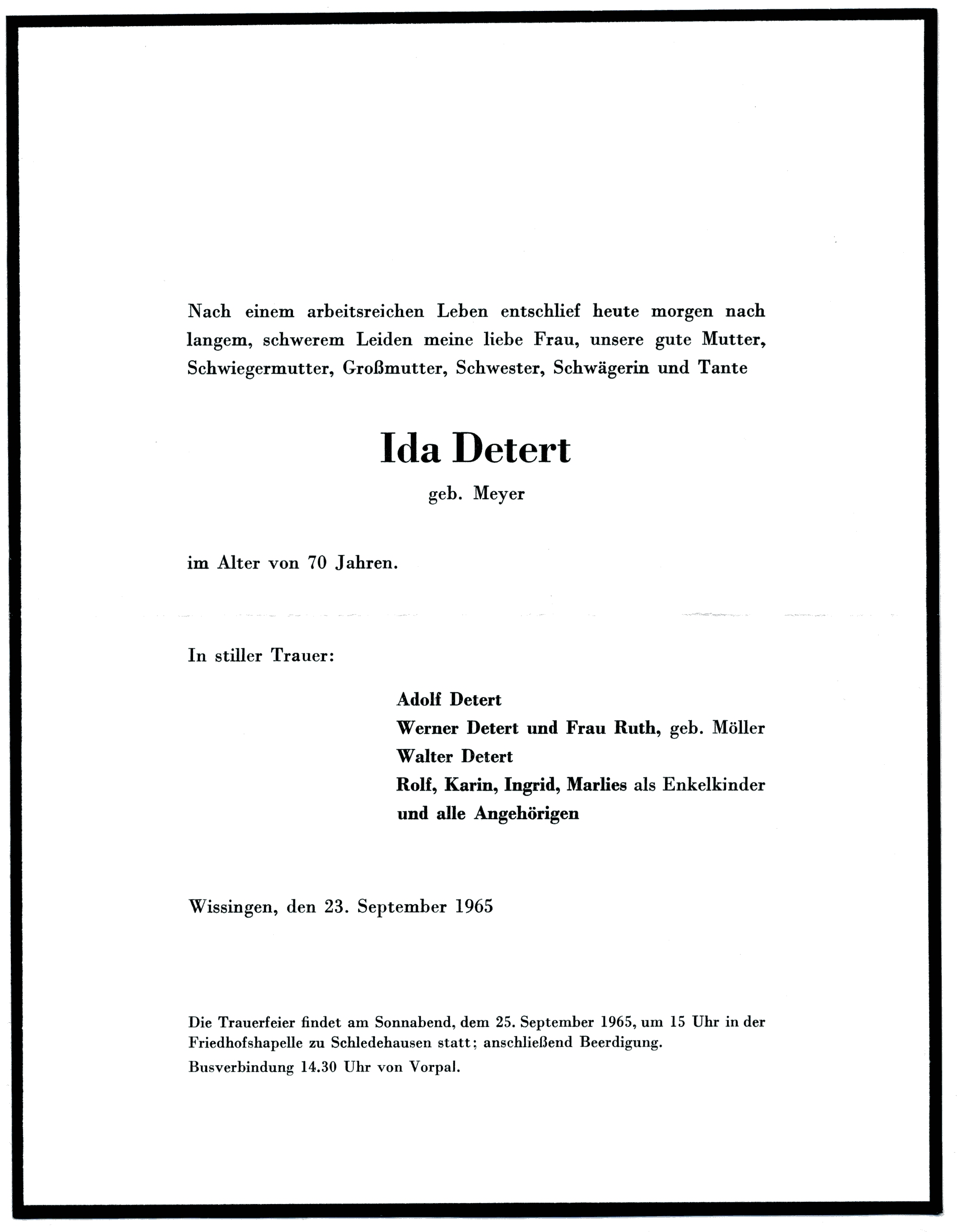 | Tod eines Vaters | Adolf Johann DETERT 29. September 1975 (Alter 48 Jahre) Quelle: Traueranzeige |
