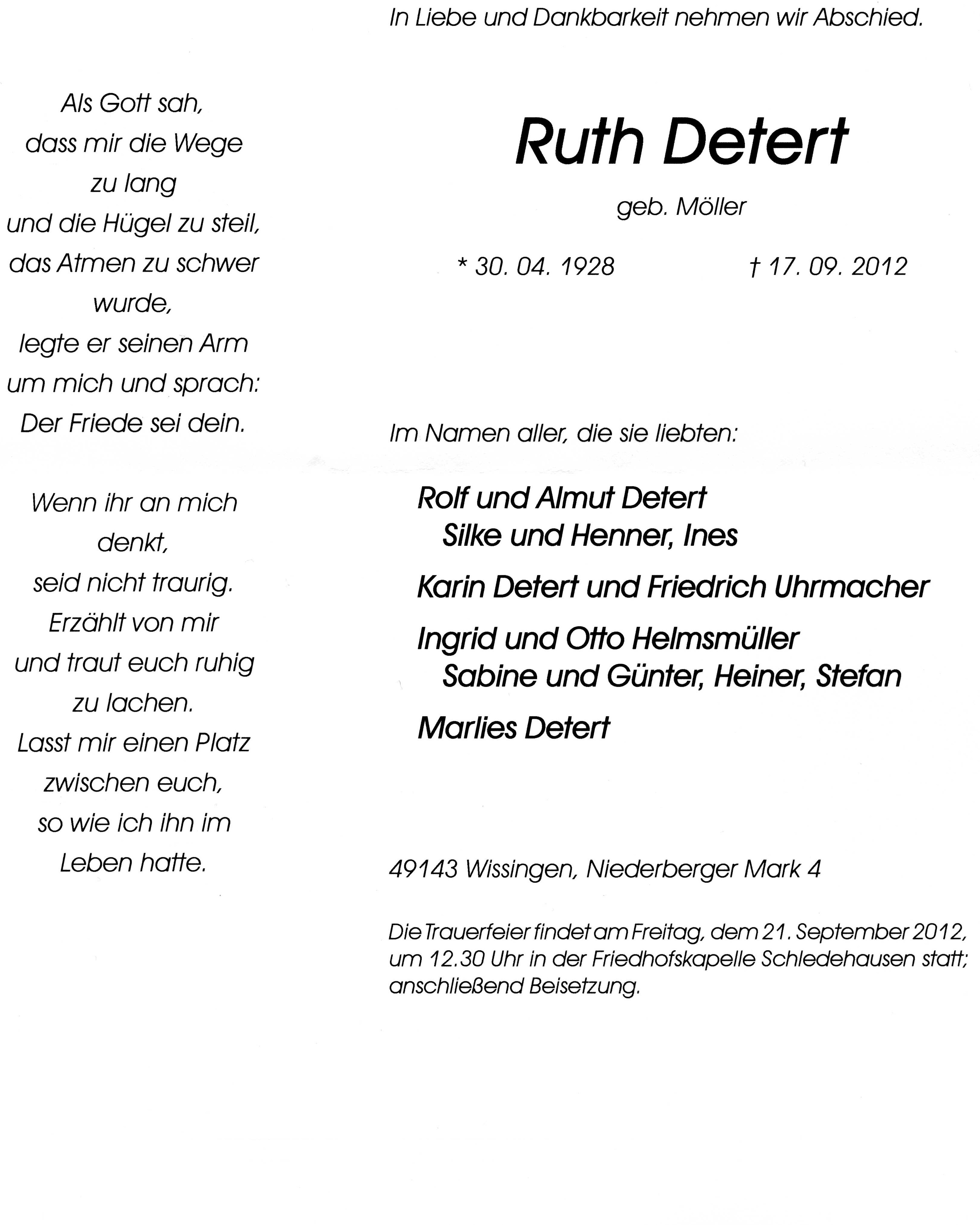 | Tod eines Ehemanns | Werner DETERT 16. März 1998 (Alter 69 Jahre) Quelle: Traueranzeige |
