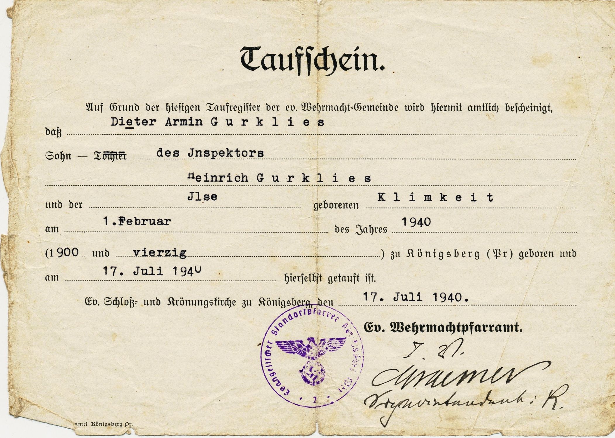 | Taufe eines Bruders | Dieter Armin GURKLIES 17. Juli 1940 (Alter 9 Jahre) Quelle: Taufbescheinigung |