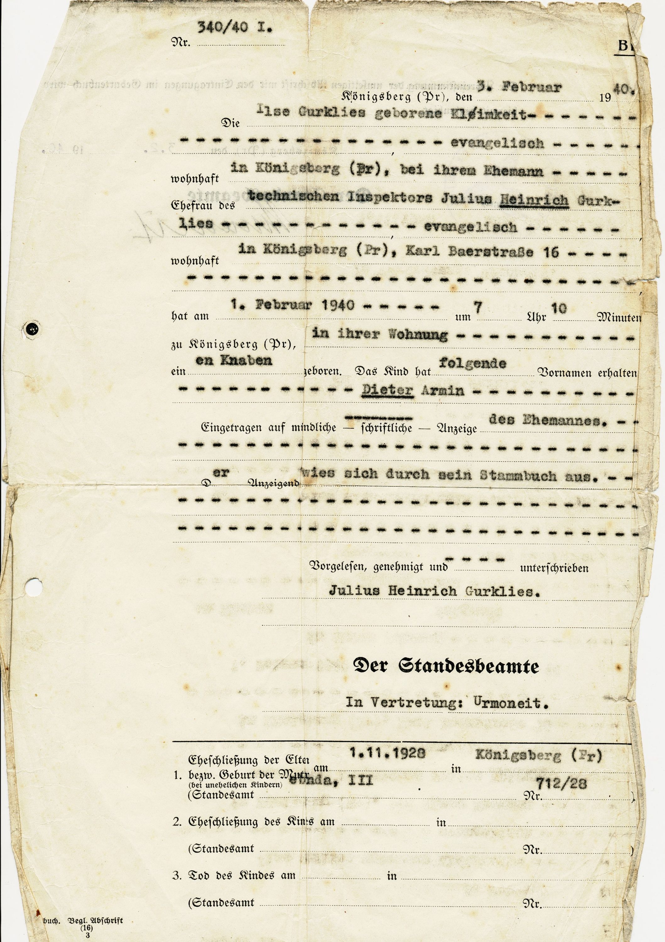 | Geburt eines Bruders | Dieter Armin GURKLIES 1. Februar 1940 (Alter 8 Jahre) Quelle: Geburtsurkunde |