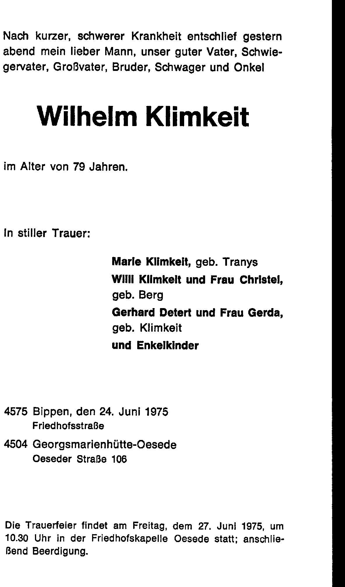 | Tod eines Bruders | Wilhelm Martin KLIMKEIT 23. Juni 1975 (Alter 75 Jahre) Quelle: Traueranzeige |