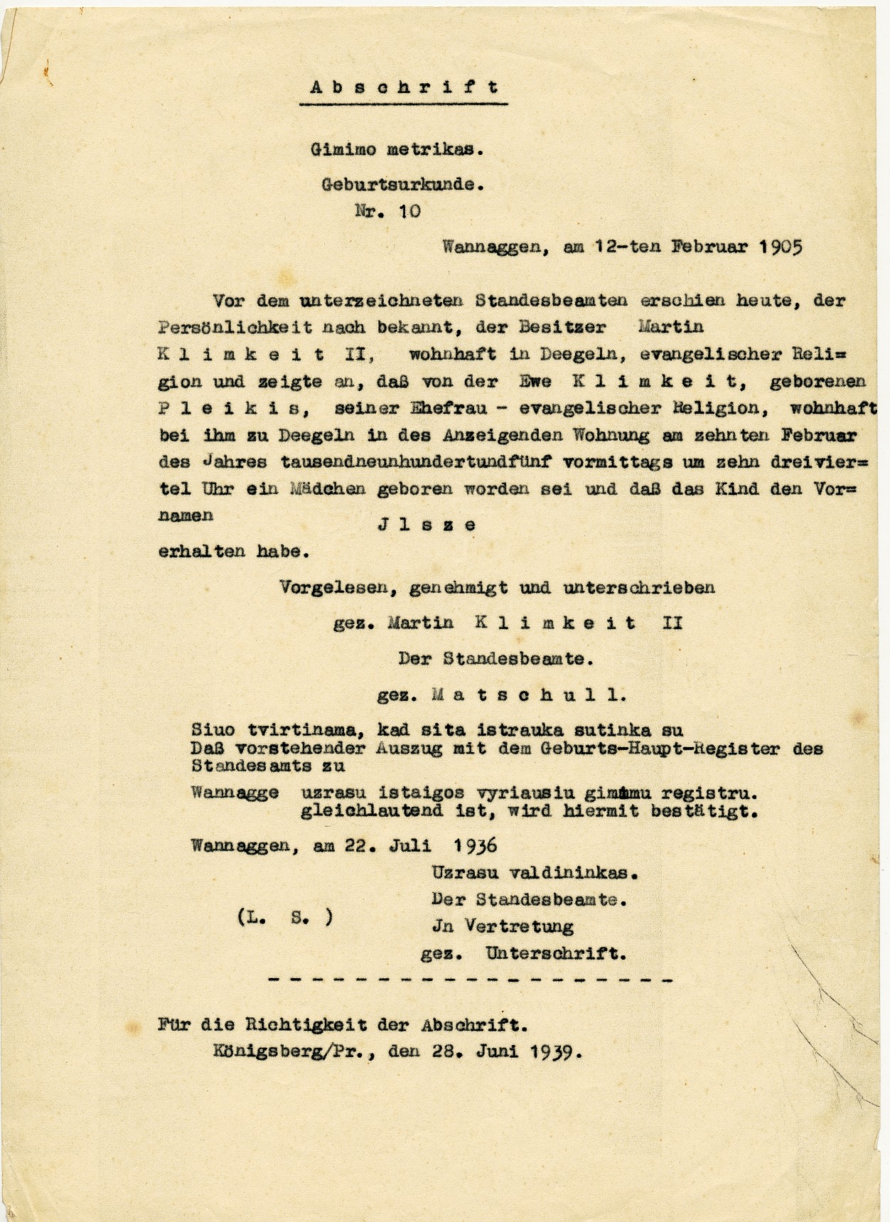 | Geburt einer Schwester | Ilsze KLIMKEIT 10. Februar 1905 (Alter 5 Jahre) Quelle: Taufbescheinigung Quelle: Geburtsurkunde, Abschrift |