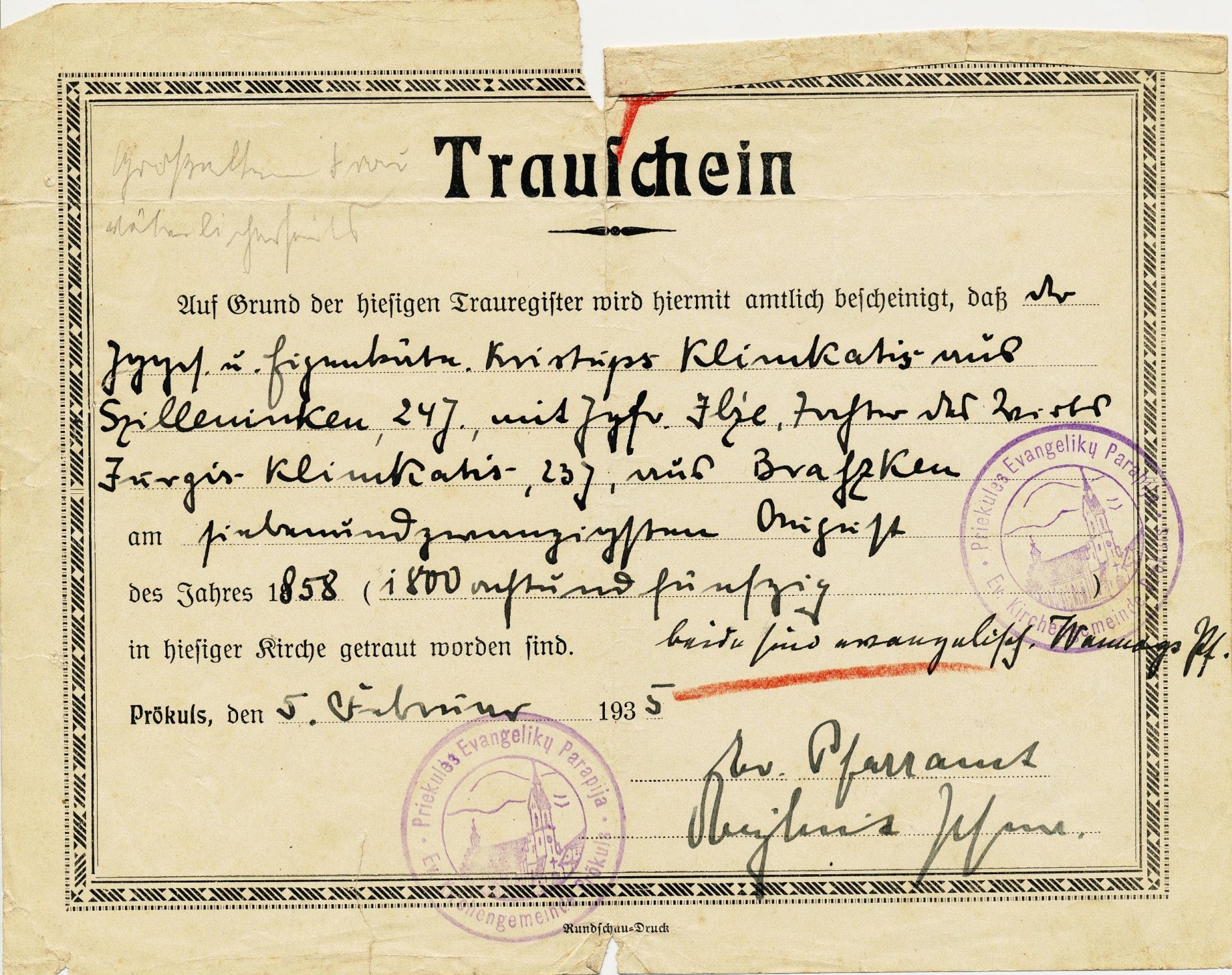 | Heirat eines Kinds | Christoph (Kristups) KLIMKEIT — Ilse KLIMKEIT — Diese Familie ansehen 27. August 1858 (Alter 41 Jahre) Quelle: Trauschein |