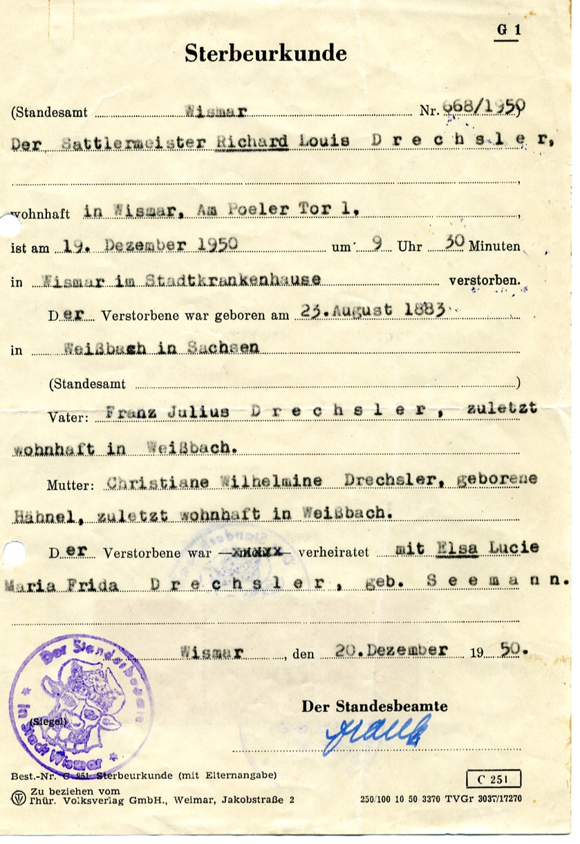 | Tod eines mütterlichen Großvaters | Louis Richard DRECHSLER 19. Dezember 1950 (Alter 13 Jahre) Quelle: Sterbeurkunde |
