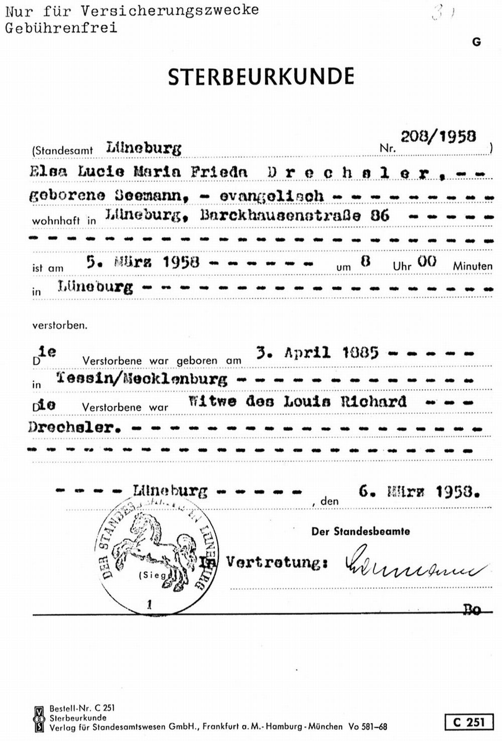 | Tod einer mütterlichen Großmutter | Elsa Lucie Maria Frieda SEEMANN 4. März 1958 (Alter 20 Jahre) Quelle: Sterbeurkunde |