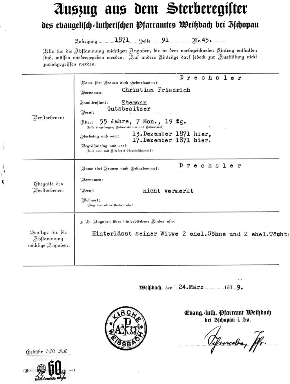 | Tod eines Vaters | Carl Traugott DRECHSLER 17. Dezember 1853 (Alter 37 Jahre) Quelle: Auszug aus dem Sterberegister |