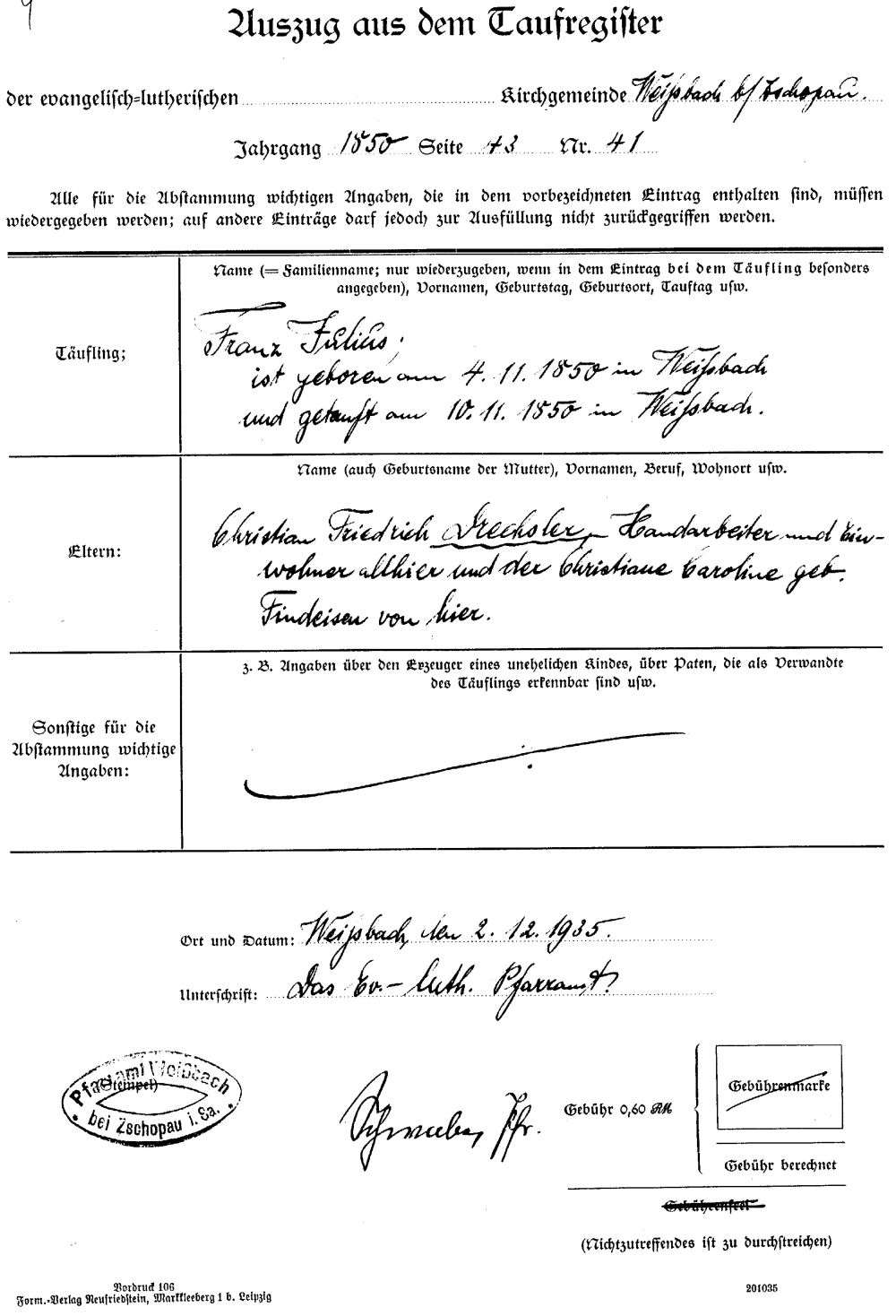 | Geburt eines Sohns #6 | Franz Julius DRECHSLER 4. November 1850 (Alter 34 Jahre) Quelle: Auszug aus dem Taufregister |