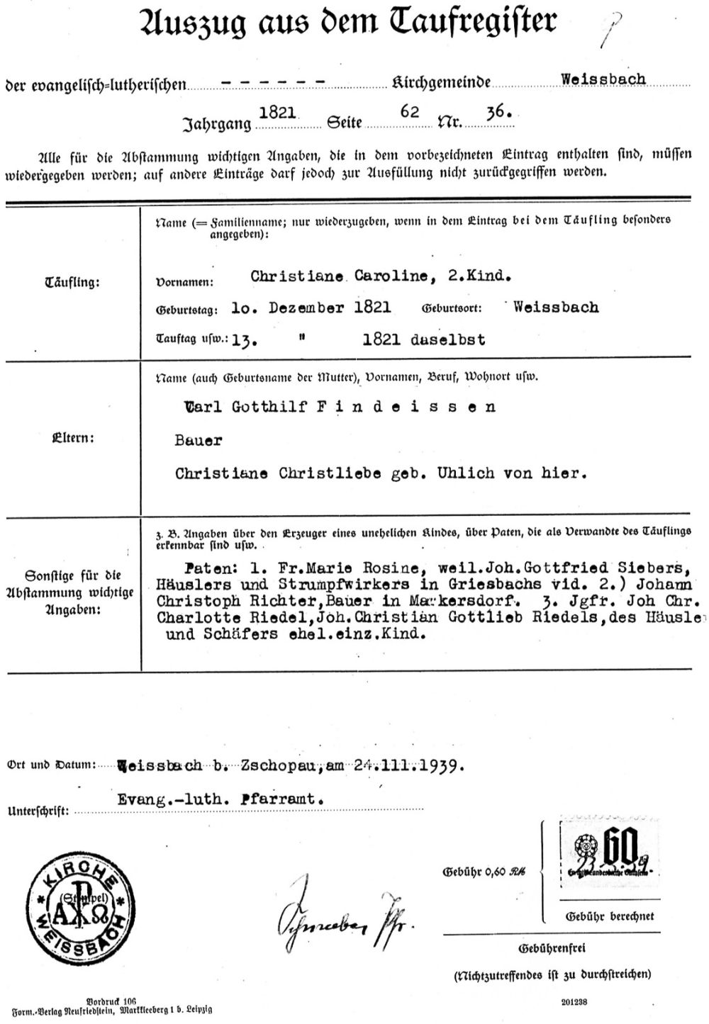 | Taufe einer Tochter | Christiane Caroline FINDEISEN 13. Dezember 1821 (Alter 21 Jahre) Quelle: Auszug aus dem Taufregister |