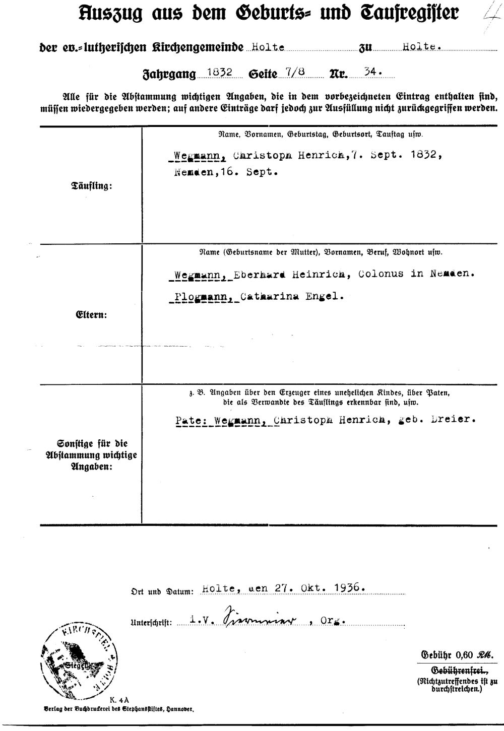 Heirat: 26. Oktober 1831 — Holte (Bissendorf), Osnabrück, Niedersachsen, DEUTSCHLAND |