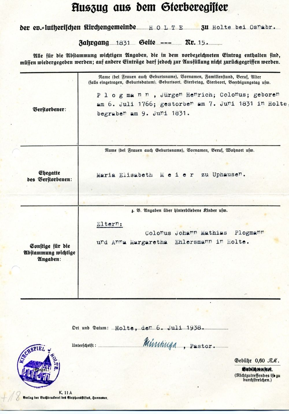 Jürgen Heinrich PLOGMANN Geburt: 6. Juli 1766 44 42 — Holte (Bissendorf), Osnabrück, Niedersachsen, DEUTSCHLAND Tod: 7. Juni 1831 — Holte (Bissendorf), Osnabrück, Niedersachsen, DEUTSCHLAND |