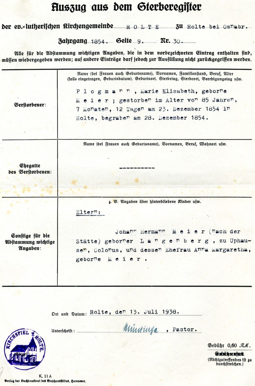 Johann Matthias Heinrich PLOGMANN gnt. LANGENBERG Geburt: 13. September 1793 27 24 — Holte (Bissendorf), Osnabrück, Niedersachsen, DEUTSCHLAND Tod: 7. August 1864 — Holte (Bissendorf), Osnabrück, Niedersachsen, DEUTSCHLAND |
