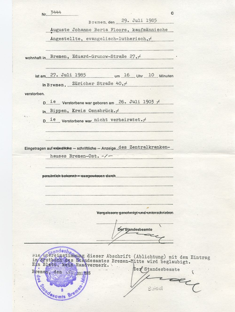 | Tod einer Halbschwester | Gertrud Friederike Wilhelmine FLOORS 6. Dezember 1961 (Alter 58 Jahre) Quelle: Sterbeurkunde |