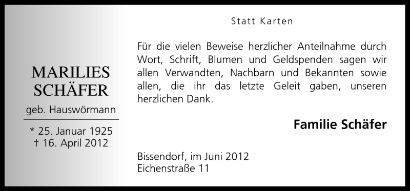 | Tod einer Tochter | Marilies (Marie Louise ?) HAUSWÖRMANN 16. April 2012 (Alter 115 Jahre) Quelle: Traueranzeige |