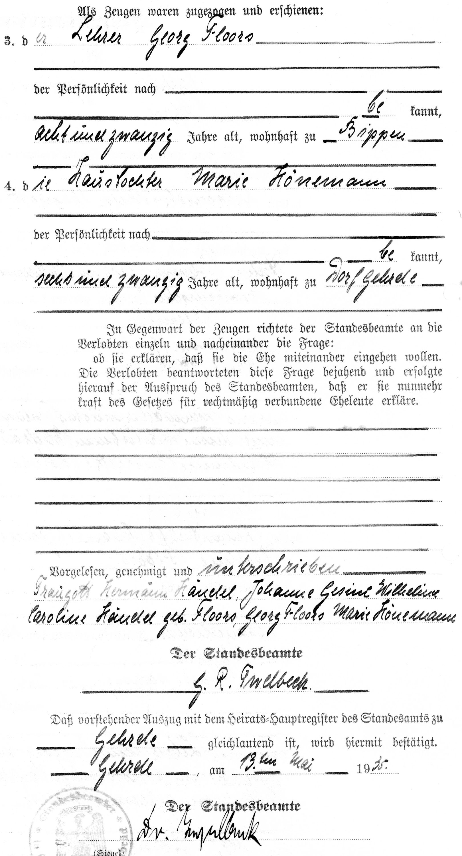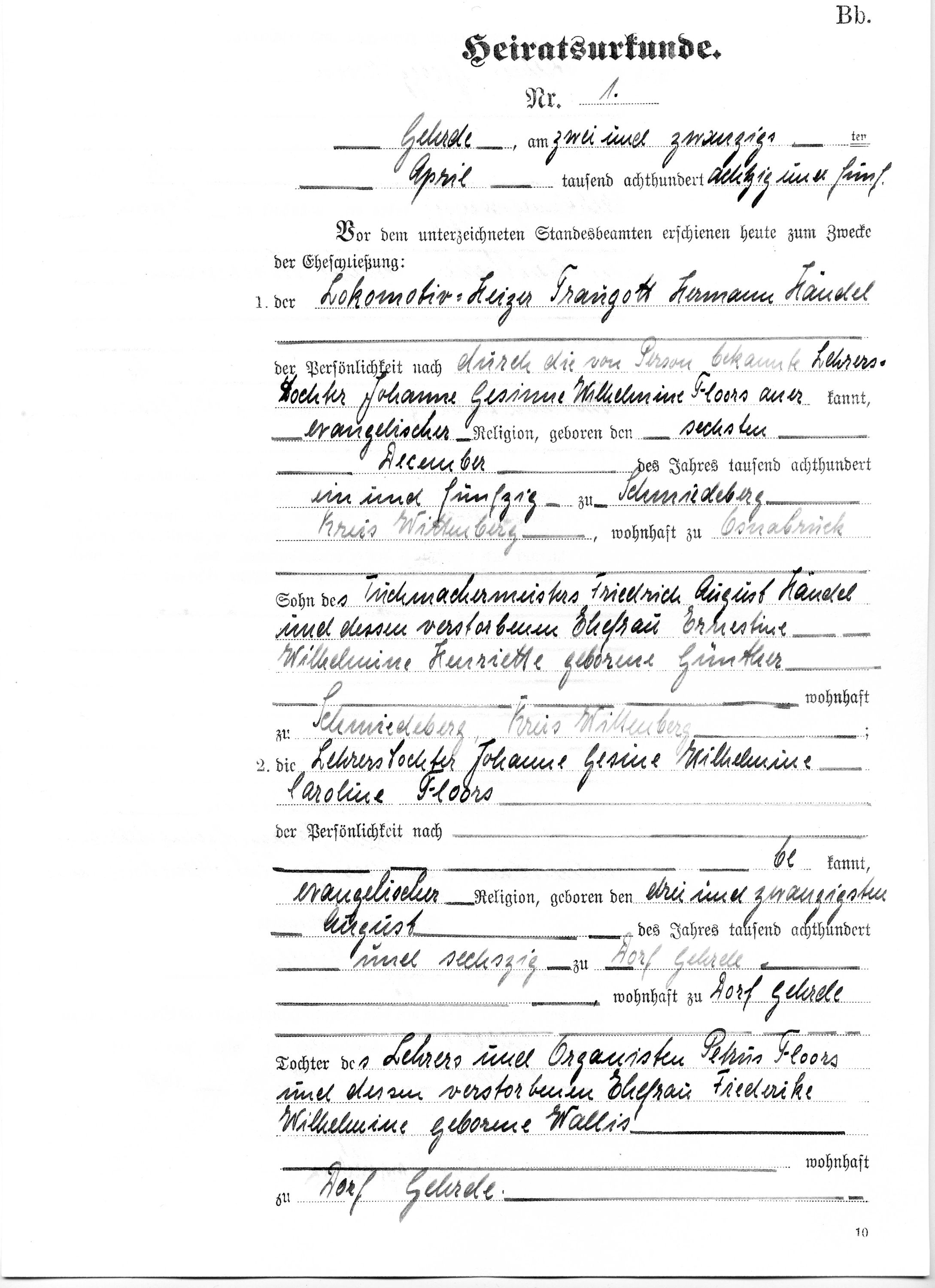 | Heirat eines Kinds | Traugott Hermann HÄNDEL — Johanne Gesine Wilhelmine Karoline FLOORS — Diese Familie ansehen 22. April 1885 (Alter 67 Jahre) |