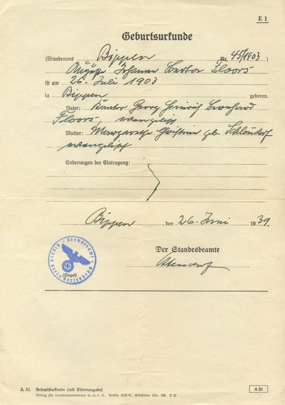Geburt: 26. Juli 1903 46 35 — Bippen, Osnabrück, Niedersachsen, DEUTSCHLAND Tod: 27. Juli 1985 — Bremen, Bremen, Bremen, DEUTSCHLAND |