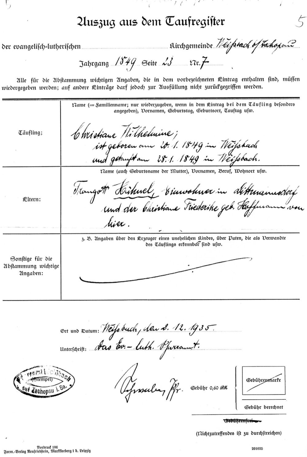 Heirat: 3. Mai 1846 — Weißbach (Amtsberg), Erzgebirgskreis, Sachsen, DEUTSCHLAND |