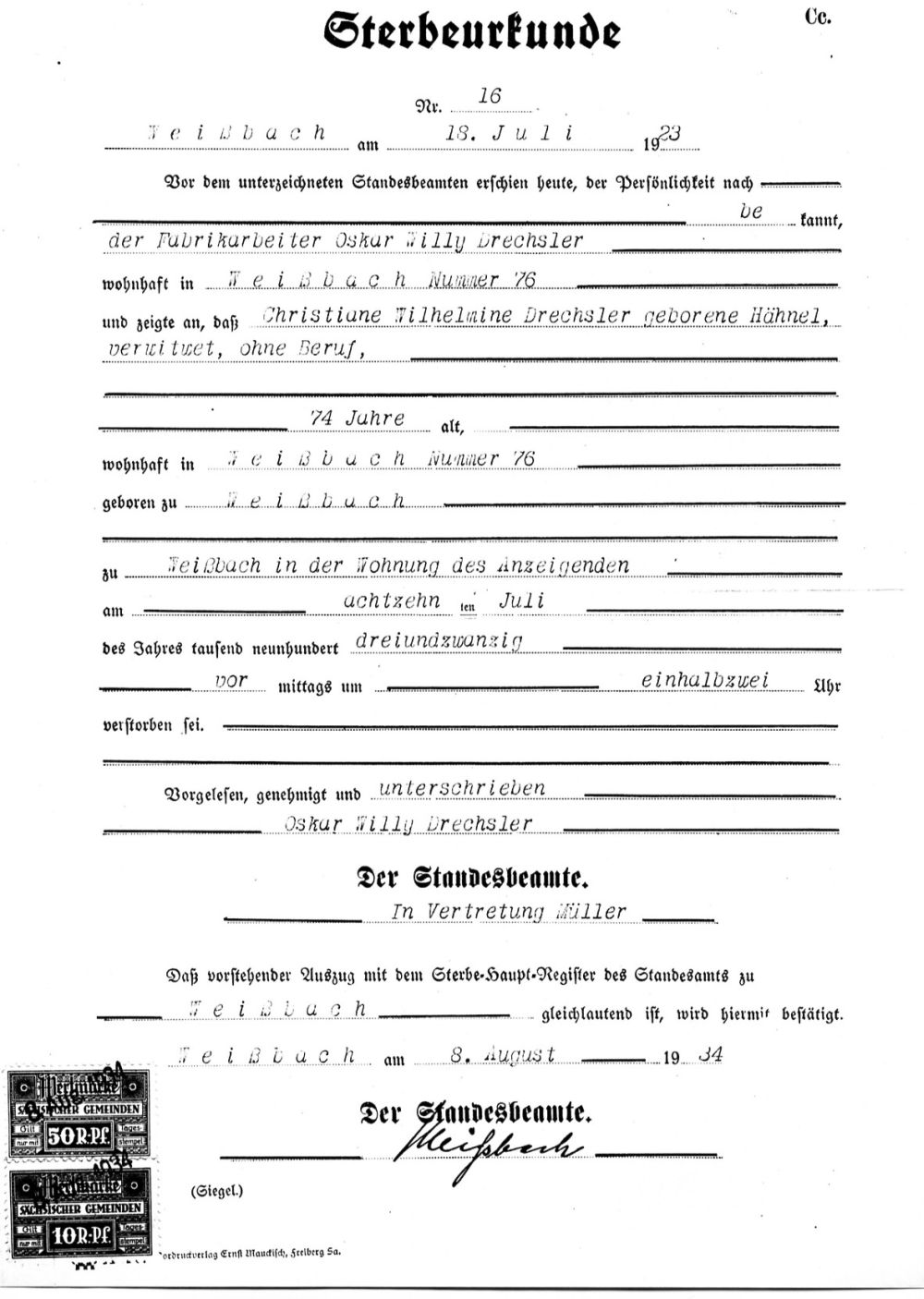 Christiane Wilhelmine HÄHNEL Geburt: 20. Januar 1849 35 27 — Weißbach (Amtsberg), Erzgebirgskreis, Sachsen, DEUTSCHLAND Tod: 18. Juli 1923 — Weißbach (Amtsberg), Erzgebirgskreis, Sachsen, DEUTSCHLAND |