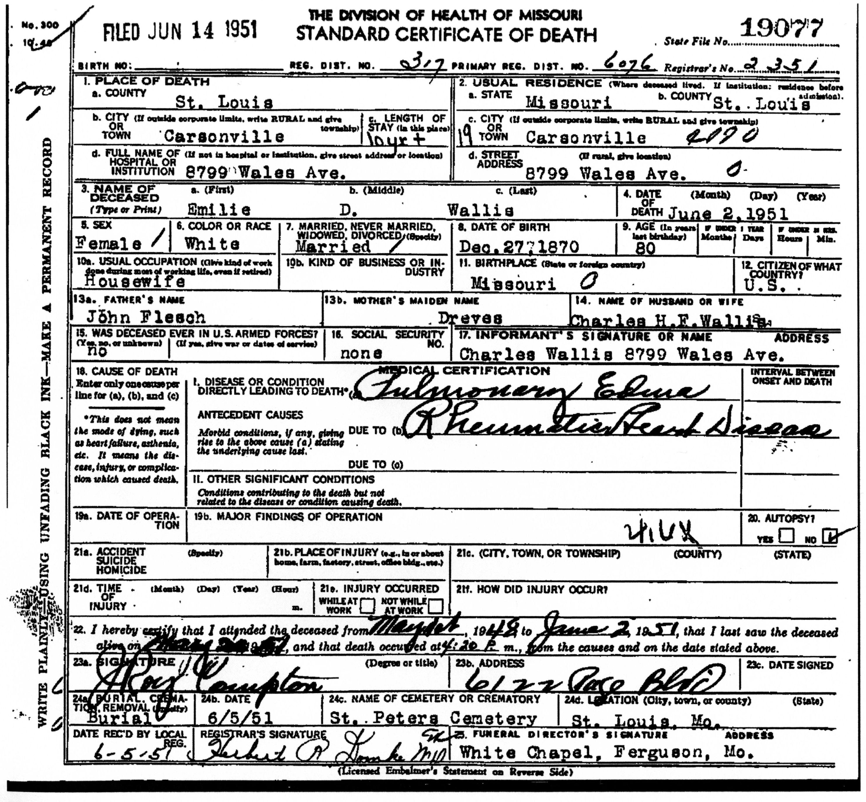 Emilie Dorothea Maria FLESCH Geburt: 27. Dezember 1870 — Carsonville, St. Louis, Missouri, USA Tod: 2. Juni 1951 — Carsonville, St. Louis, Missouri, USA |