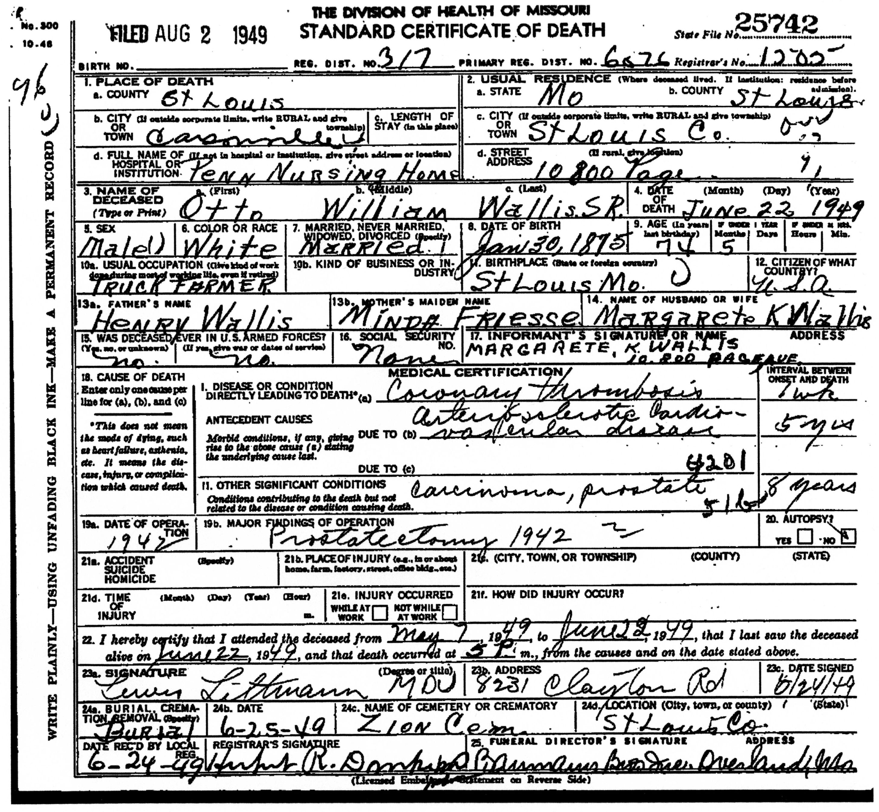 | Tod eines Ehemanns | Otto William WALLIS 22. Juni 1949 (Alter 70 Jahre) Quelle: Find a grave |
