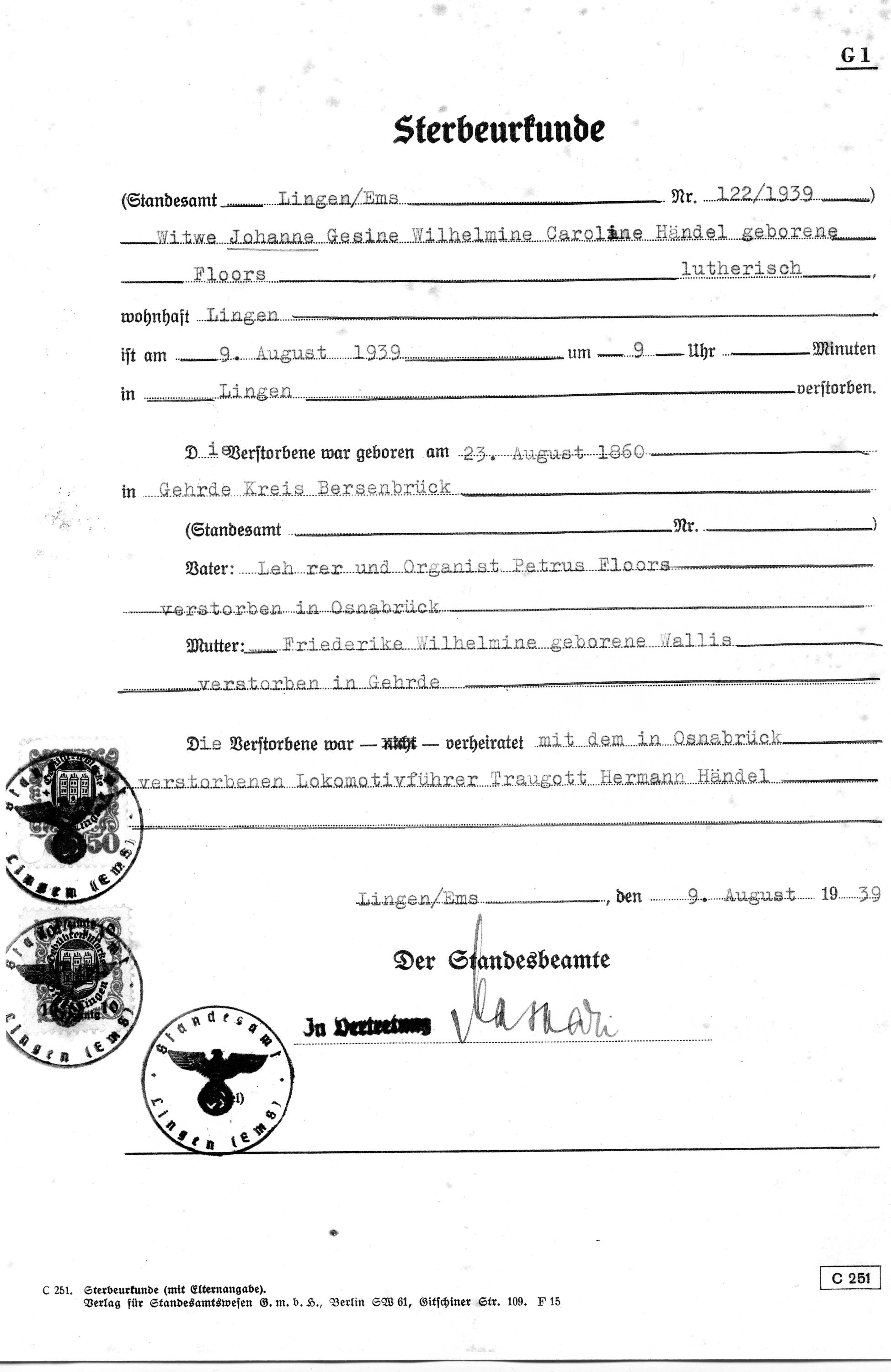 | Tod einer mütterlichen Großmutter | Johanne Gesine Wilhelmine Karoline FLOORS 9. August 1939 (Alter 25 Jahre) |