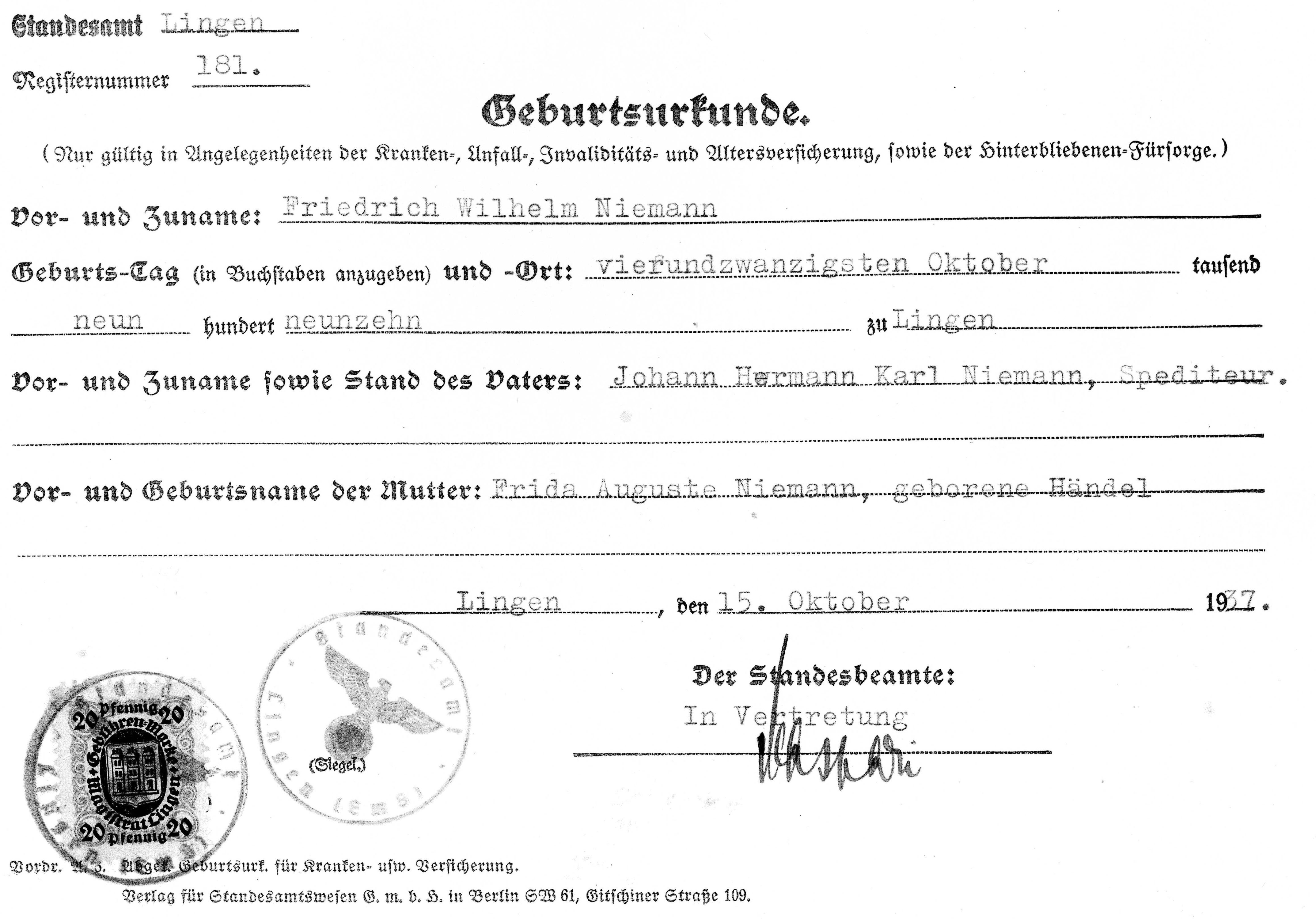| Geburt eines Bruders | Friedrich „Wilhelm“ NIEMANN 24. Oktober 1919 (Alter 5 Jahre) |