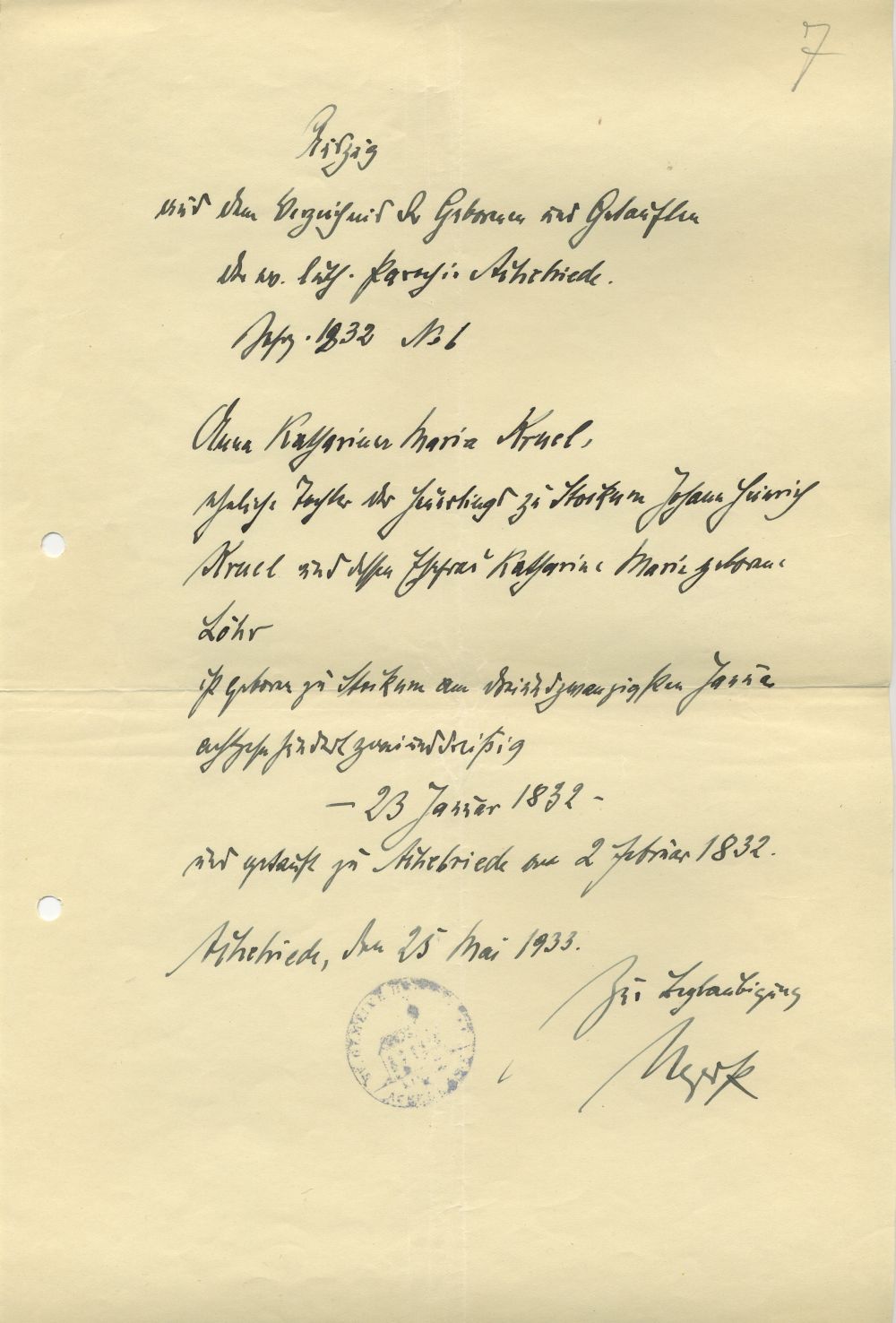 | Taufe einer Tochter | Anna Katharine Marie KRUEL 2. Februar 1832 (Alter 33 Jahre) |