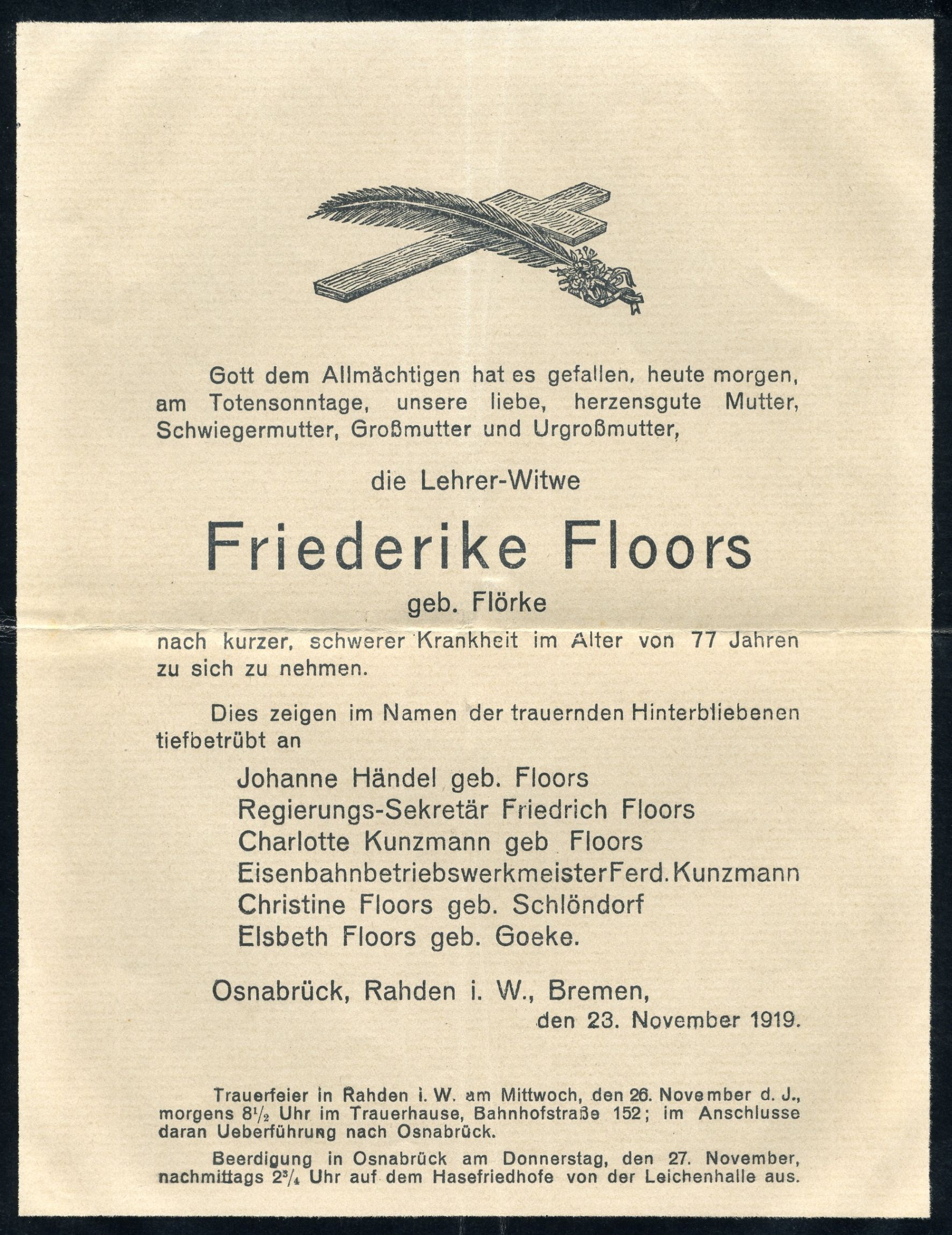 | Tod einer väterlichen Großmutter | Friederike Wilhelmine Charlotte FLÖRKE 23. November 1919 (Alter 2 Jahre) Quelle: Traueranzeige |