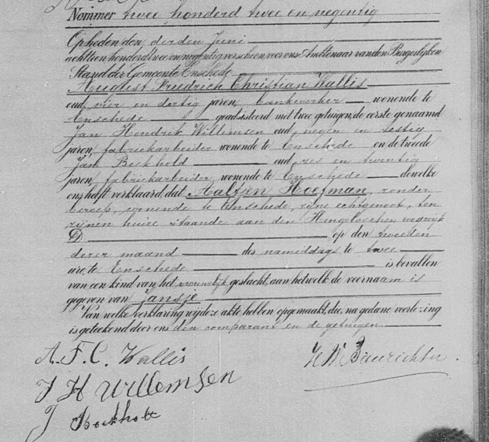 Aaltjen HOEFMAN Geburt: um 1860 — Deventer, Deventer, Overijssel, NIEDERLANDE Tod: 3. Februar 1898 — Enschede, Enschede, Overijssel, NIEDERLANDE |