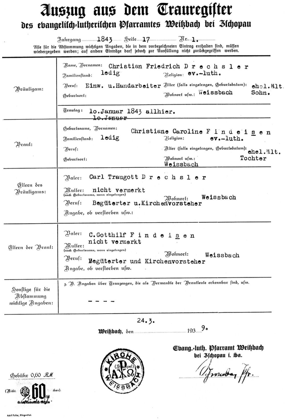 | Christian Friedrich DRECHSLER | 26 | Christiane Caroline FINDEISEN | 21 | 182 | Weißbach (Amtsberg), Erzgebirgskreis, Sachsen, DEUTSCHLAND | 6 | YES | Y | |||||||