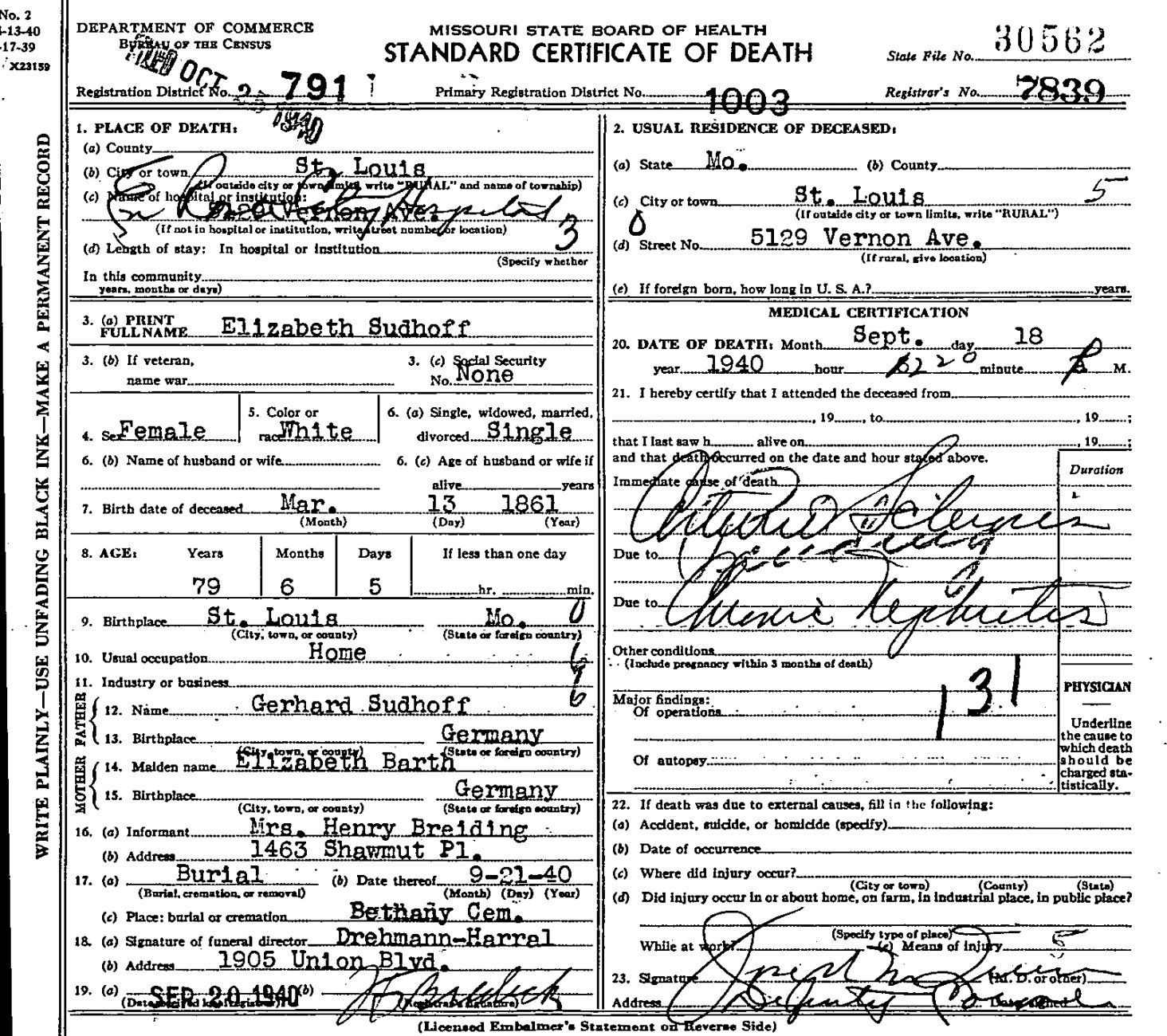 | Elizabeth (Lizzie) (Anna Maria Elisabeth) SUDHOFF | 13. März 1861 | 164 | St. Louis, St. Louis, Missouri, USA | 0 | 18. September 1940 | 85 | 79 | St. Louis, St. Louis, Missouri, USA | F | YES | Y100 | |||||