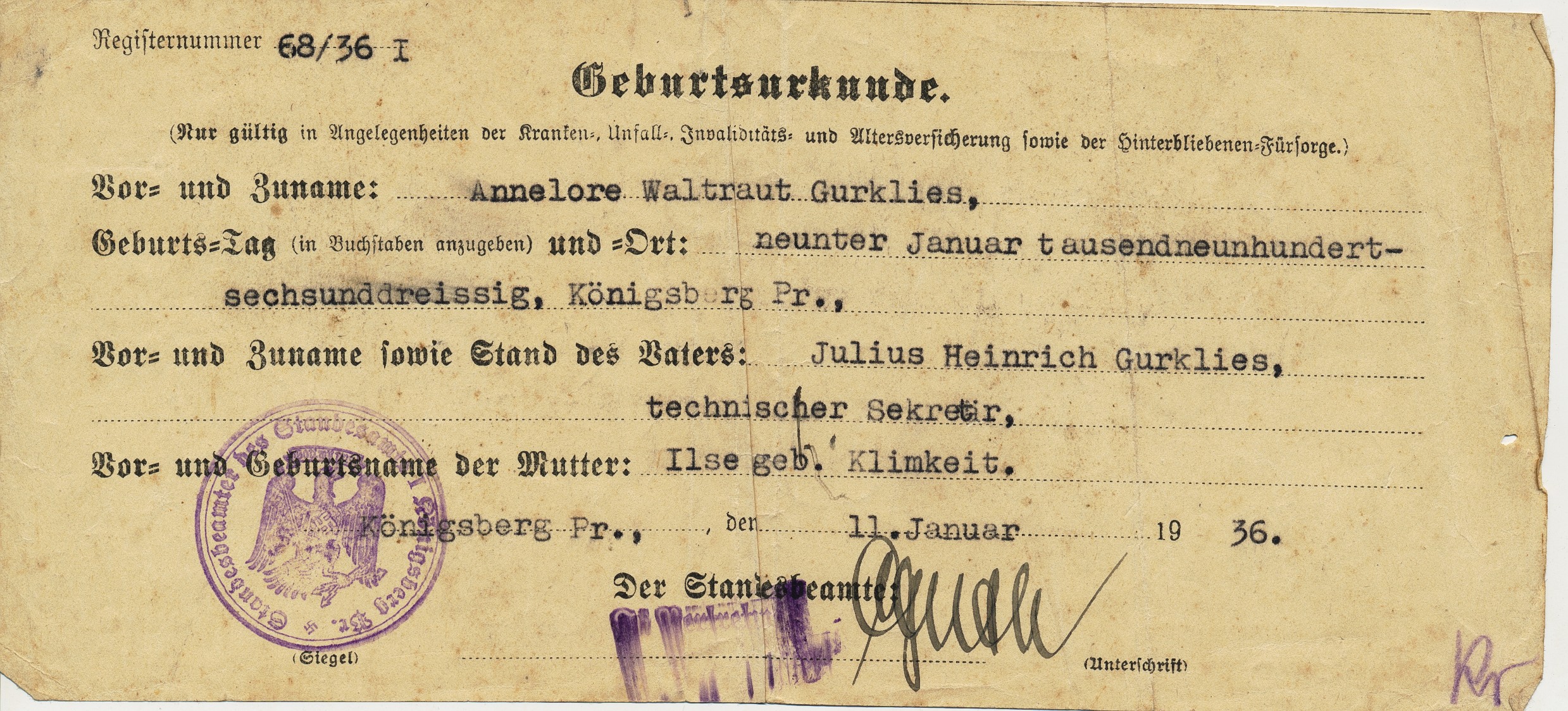 | Geburt einer Tochter #4 | Anelore Waltraud GURKLIES 9. Januar 1936 (Alter 34 Jahre) Quelle: Geburtsurkunde |