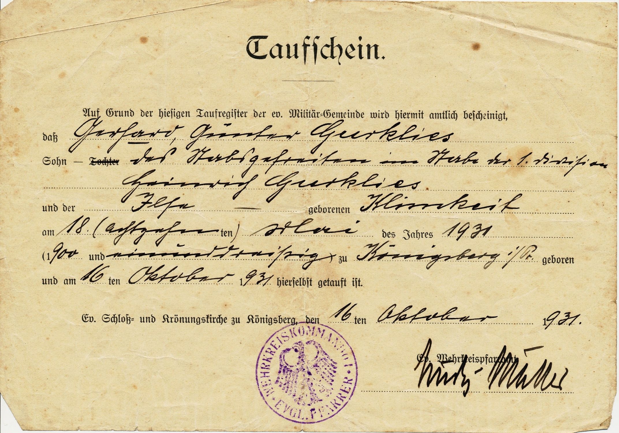 | Taufe eines Sohns | Gerhard Günther GURKLIES 16. Oktober 1931 (Alter 30 Jahre) Quelle: Taufbescheinigung |