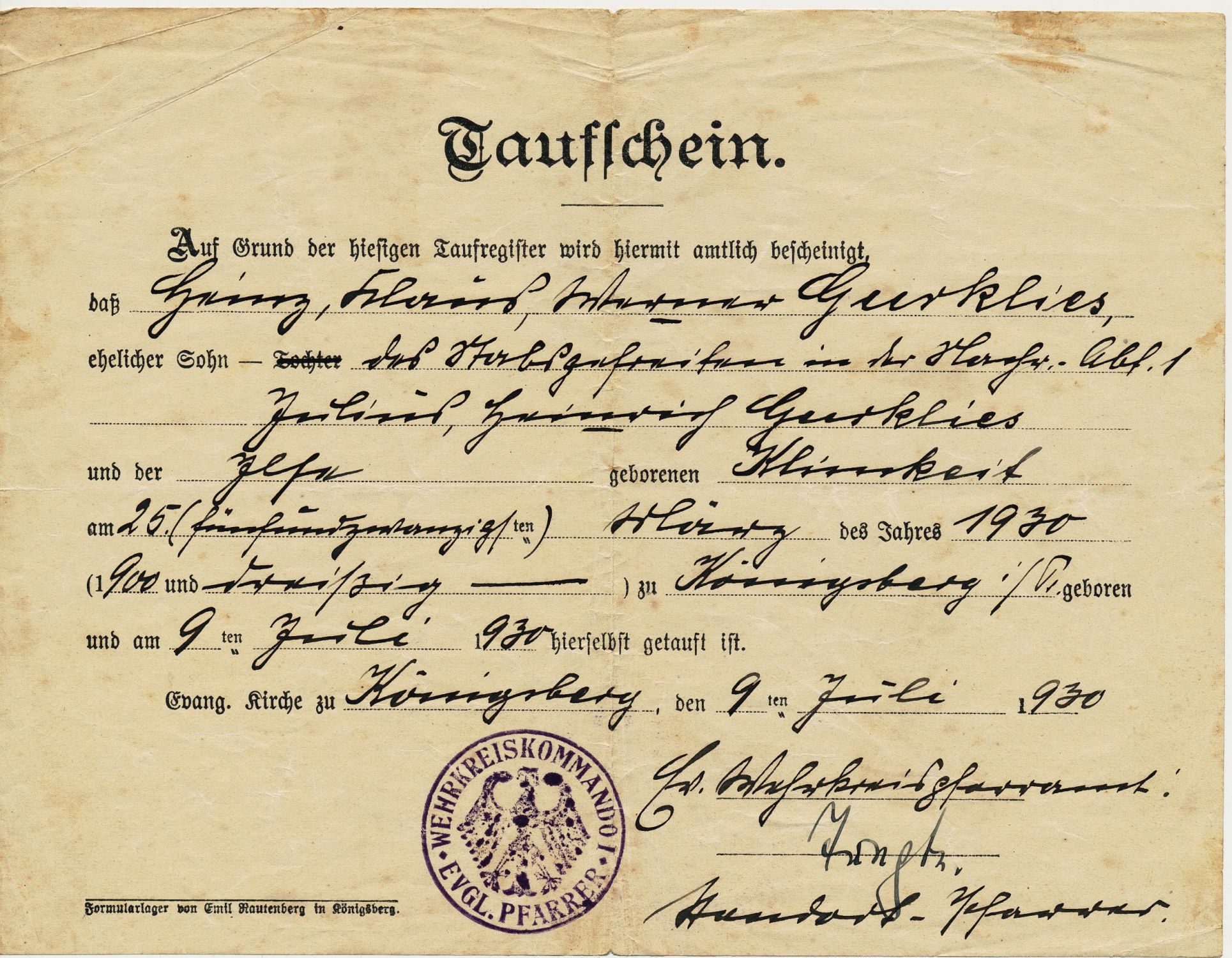 | Taufe eines Sohns | Heinz Klaus „Werner“ GURKLIES 9. Juli 1930 (Alter 29 Jahre) Quelle: Taufbescheinigung |