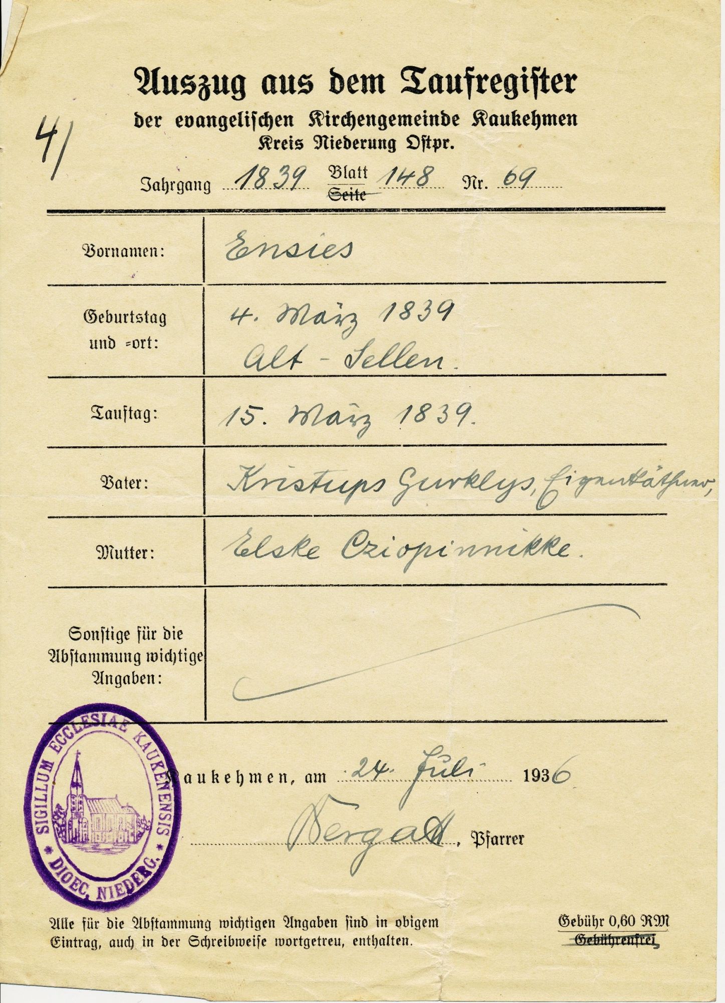 | Taufe eines Sohns | Endrikis (Heinrich) GURKLYS 11. August 1872 (Alter 33 Jahre) Quelle: Taufbescheinigung |