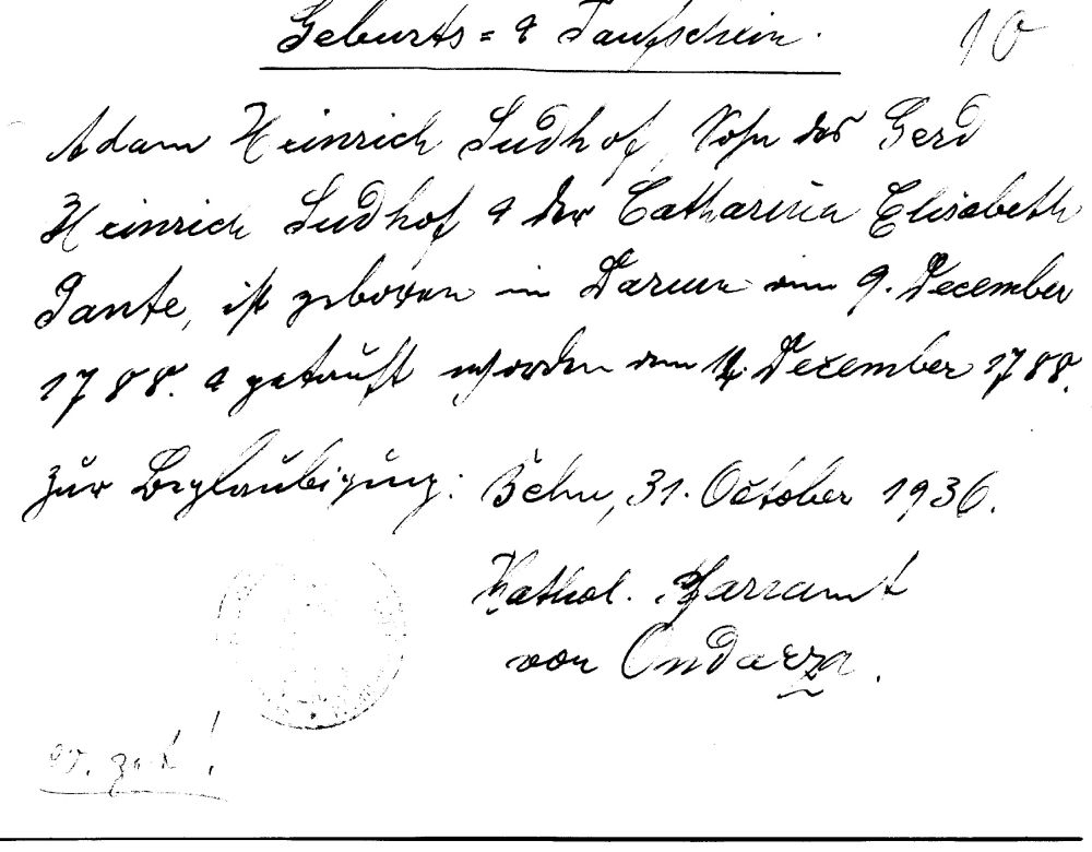 Johann Adam (Sutthof) SUDHOFF Geburt: 4. Januar 1782 29 29 — Darum (Osnabrück), Osnabrück, Niedersachsen, DEUTSCHLAND |