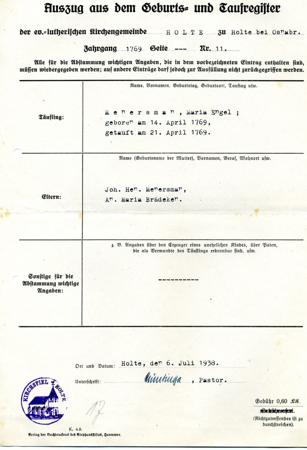 Cath. Engel MENERSMANN Geburt: 27. August 1773 43 32 — Holte (Bissendorf), Osnabrück, Niedersachsen, DEUTSCHLAND |