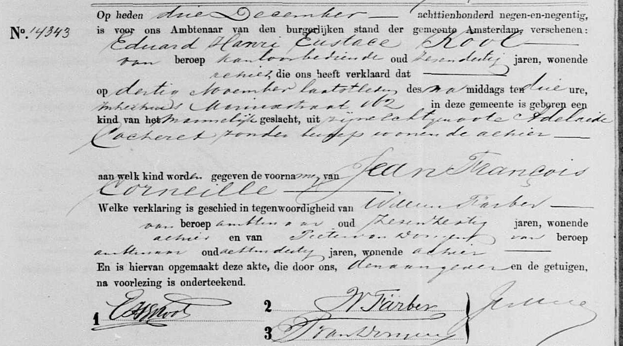 | Geburt eines Sohns #3 | Jean François Corneille KOOL 30. November 1899 (Alter 36 Jahre) Quelle: Amsterdam, Civil Registration |